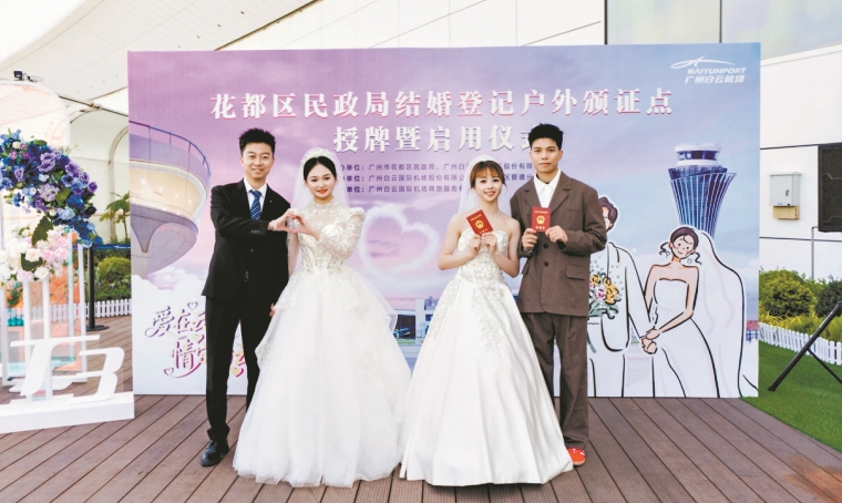 广州日报讯 (全媒体记者董业衡 通讯员廖艳辉摄影报道)昨日,花都区民政局与广州白云国际机场股份有限公司携手共建的结婚登记户外颁证点授牌仪式在白云机场T3航站楼观景平台举行。这标志着全国首个设于大型国际机场航站楼内的结婚登记户外颁证点正式启用,成为花都区拓展“甜蜜经济”新版图、创新幸福消费场景的又一里程碑。