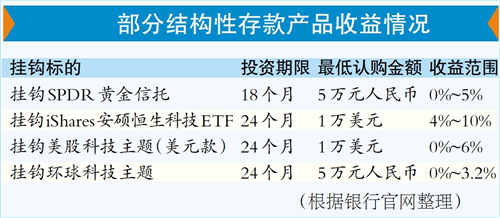 如有银行推出挂钩SPDR黄金信托的一款结构性存款,24个月投资期限的收益率范围为4%—10%,风险评级为3级,最低认购金额1万美元,到期100%本金保障。