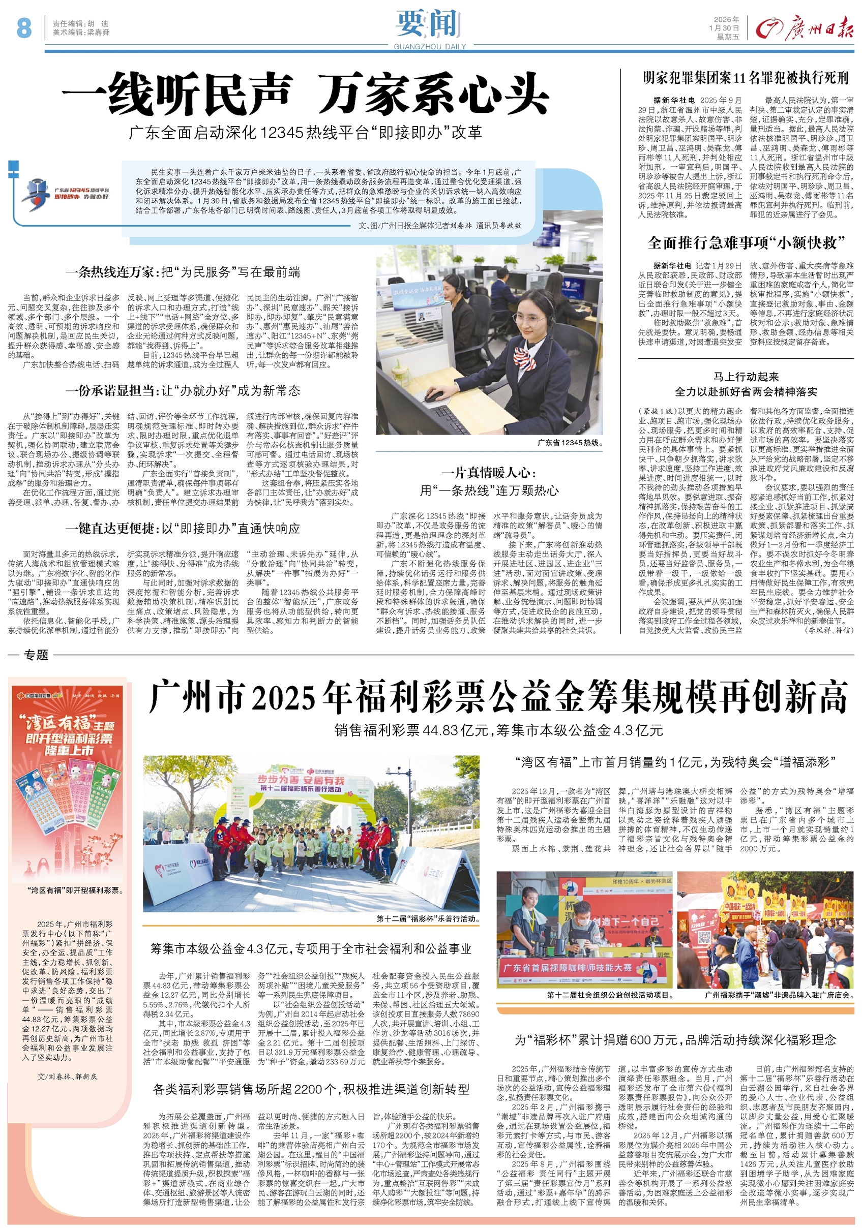- 一线听民声 万家系心头 民生实事一头连着广东千家万户柴米油盐的日子,一头系着省委、省政府践行初心使命的担当。今年1月底前,广东全面启动深化12345热线平台“即接即办”改革,用一条热线撬动政务服务流程再造变革,通过整合优