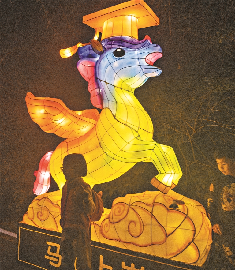 “岭南潮头”篇章聚焦广州文化传承与时代创新,展现千年名城在守正创新中焕发的“老城市新活力”。北秀湖上,绵延百米的“万马奔腾”灯组正掀起视觉风暴,作为本届灯会最大的灯组,九匹流光骏马踏浪奔腾,姿态昂扬。马在中华文化中是奋斗不止、勇往直前的象征,恰逢农历马年,灯组既象征中国人民策马扬鞭的奋斗精神,亦展现了广州勇立潮头、奋勇争先的时代姿态。