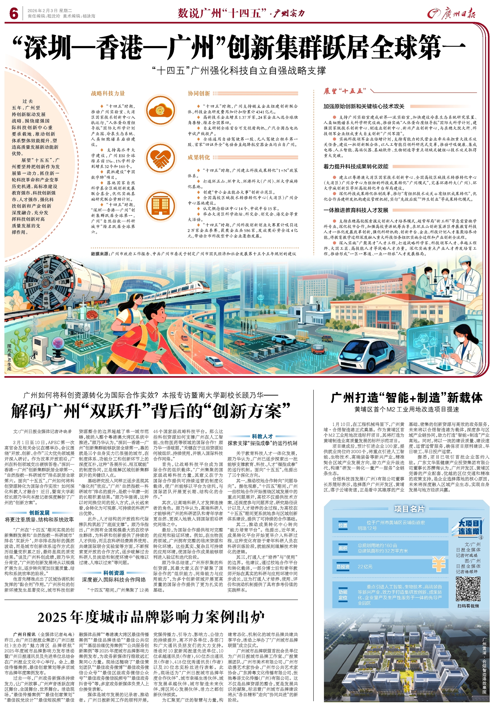 - “深圳—香港—广州”创新集群跃居全球第一 过去五年,广州坚持创新驱动发展战略,围绕建强国际科技创新中心重要承载地,推动创新体系整体效能提升,塑造高质量发展新动能新优势。 展望“十五五”,广州要坚持把创新作为发展第一动力,抓住新一轮科技