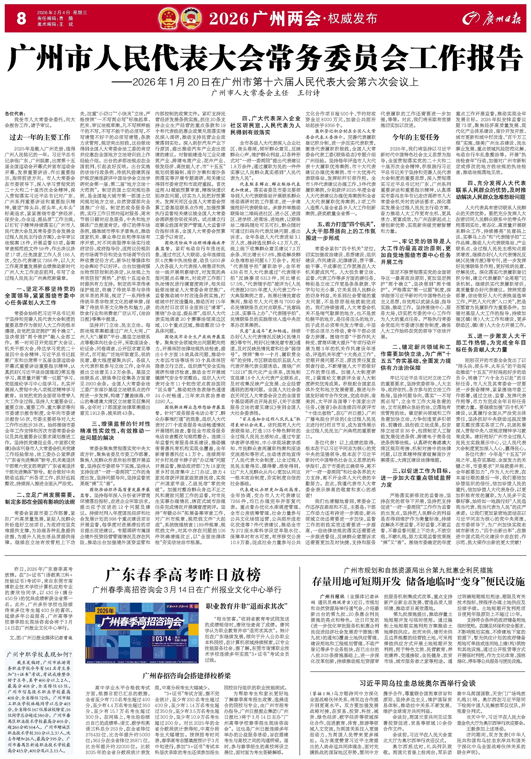 - 广州市人民代表大会常务委员会工作报告 各位代表: 我受市人大常委会委托,向大会报告工作,请予审议。 过去一年的主要工作 2025年是载入广州史册、值得广州人民铭记的一年。习近平总书记亲临广东、广州视察,出席第十五届全国
