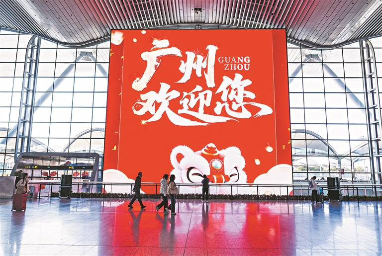 航站楼里繁花似锦,年味十足,部分工作人员身着唐装宋服上岗,机场俨然成为“城市会客厅”和“文化大舞台”,“大湾鸡”快闪、英歌舞、长隆巡游、醒狮表演、粤剧表演、时装秀等特色活动轮番上演,让旅客在旅途中沉浸式感受“广州过年 花城看花”的岭南风情和文化盛宴。
