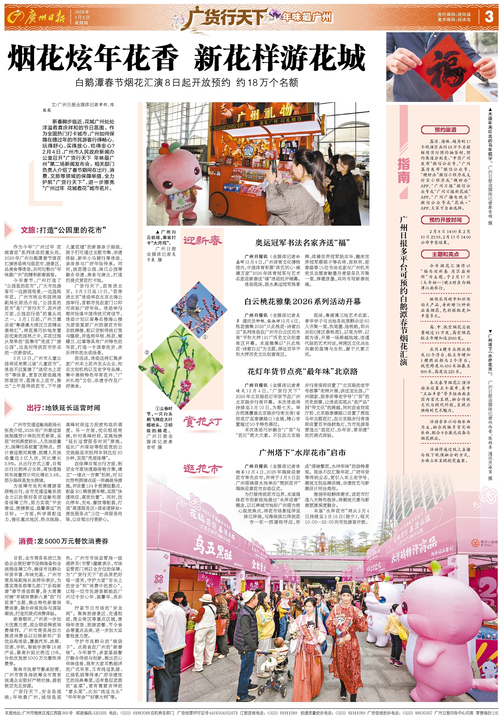 - 烟花炫年花香 新花样游花城 文/广州日报全媒体记者章程、陈薇薇 新春脚步临近,花城广州处处洋溢着喜庆祥和的节日氛围。作为全国热门打卡城市,广州如何保障在穗过年的市民游客行得畅心、玩得舒心、买得放心、吃得安心?2月4日,广