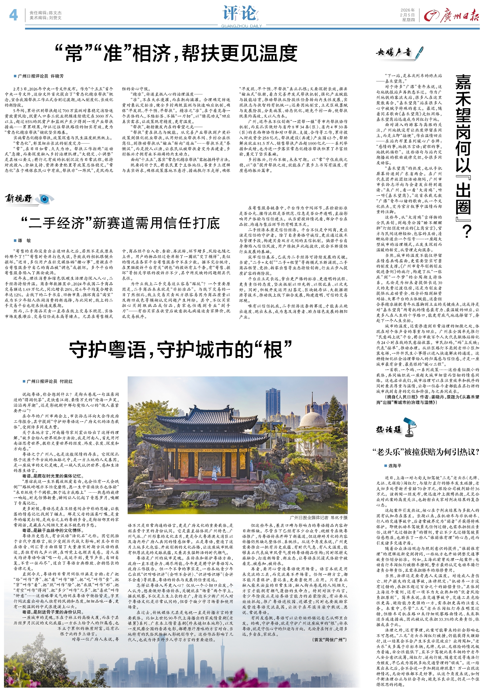 - “常”“准”相济,帮扶更见温度 广州日报评论员 许晓芳 2月3日,2026年中央一号文件发布。作为“十五五”首个中央一号文件,这份文件首次提出了“常态化精准帮扶”概念,宣告我国帮扶工作正式告别过渡期,迈入制度化、长效化的新阶