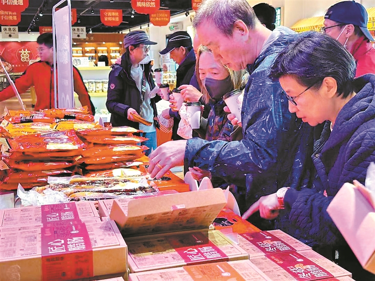 生产车间里,工人们加班加点,不断推出“年味”新品,同时也为开拓今年市场做好准备。记者在走访中了解到,目前,一些年货产品已经提前售罄。“今年春节,鑫源食品推出了鸿运锦礼、财神贺岁系列等年货新品。”东莞市鑫源食品有限公司(以下简称“鑫源食品”)总经理陈佩灵告诉记者,鸿运锦礼是一款蛋卷+糕点组合的礼盒,以锦礼贺年,寓意鸿运当头,受到新老消费者的喜爱;财神贺岁系列则包含最经典的年宵糕点椰蓉酥角、象形金钱酥、曲奇等系列产品。目前鸿运锦礼、财神贺岁曲奇已提前售罄,其他年货正在热销中。