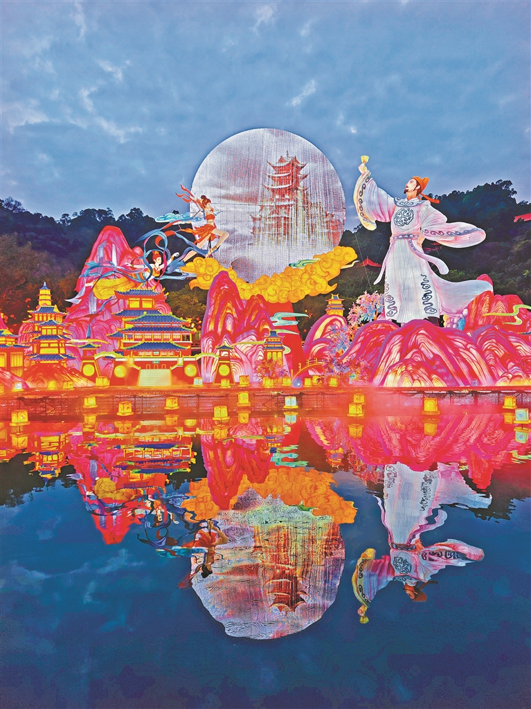 五大主题展区以流光溢彩的光影盛景迎接八方来客,带领游客于移步换景间调动全感官赏灯游园,开启一场光影艺术与硬核科技交织的奇妙之旅。这里既有魔法森林、银河漫步的赛博风格,也有李白对月、秦汉长歌的千古浪漫,还有王者荣耀、大湾鸡等顶流IP的青春脉动,为国内外游客奉上一场别开生面的视觉盛宴,成为南沙区更高起点推动人文湾区建设、深化高水平文化交流的创新实践。