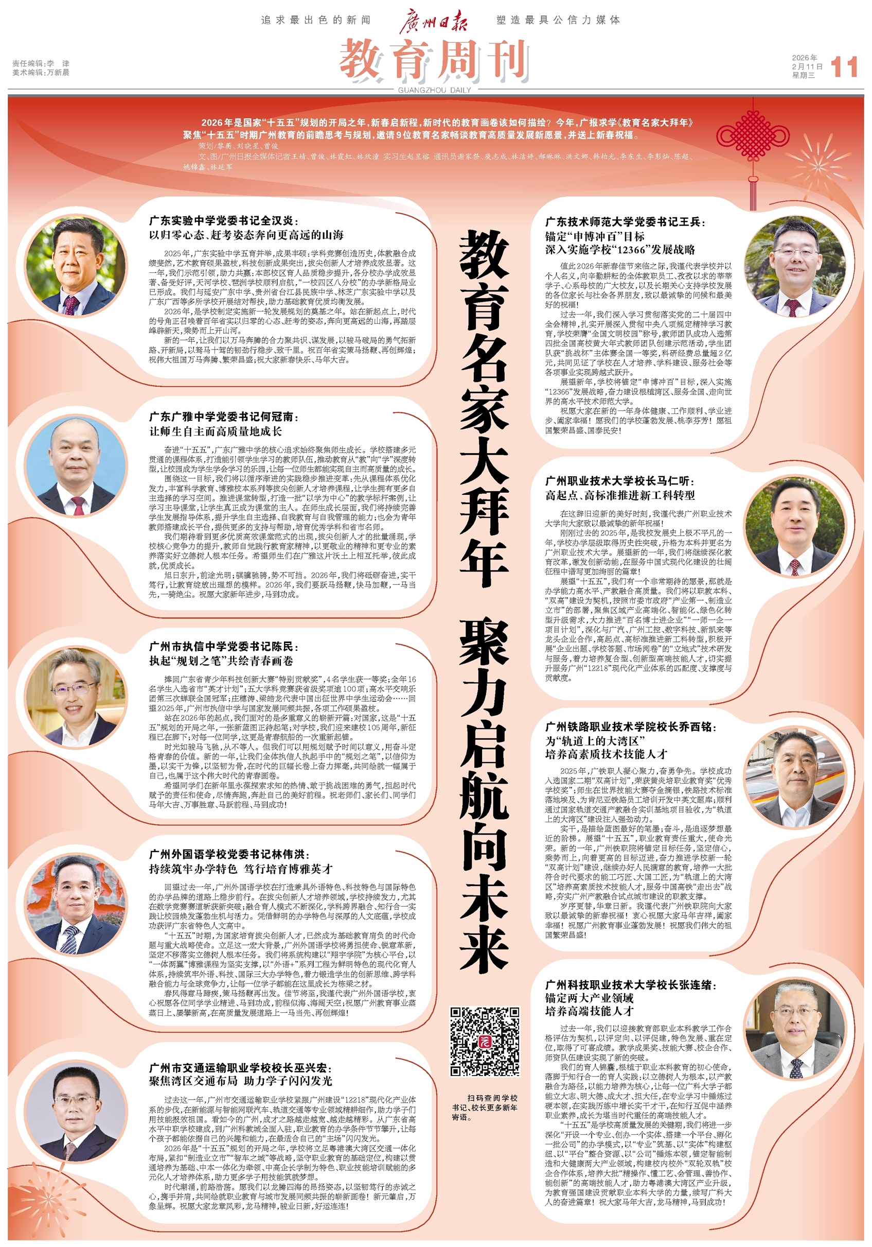 2026年是国家“十五五”规划的开局之年,新春启新程,新时代的教育画卷该如何描绘?今年,广报求学《教育名家大拜年》聚焦“十五五”时期广州教育的前瞻思考与规划,邀请9位教育名家畅谈教育高质量发展新