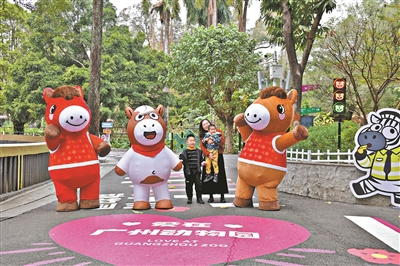 记者从广州动物园了解到,春节期间,园方精心打造多个马年专属打卡点,年味拉满、出片率超高。粉白配色的斑马线、会变色的信号灯、憨态可掬的斑马“安全疏导员”……园区里多了条温馨浪漫的“马路”。在特色动物展区,还有“河马车站”“河马大嘴巴”“牛马工位”等创意打卡点,以及位于南北门入口处的“熊猫送福”花灯、“马年行大运”主题花坛、大型卡通马气模,承包游客们的春节朋友圈。