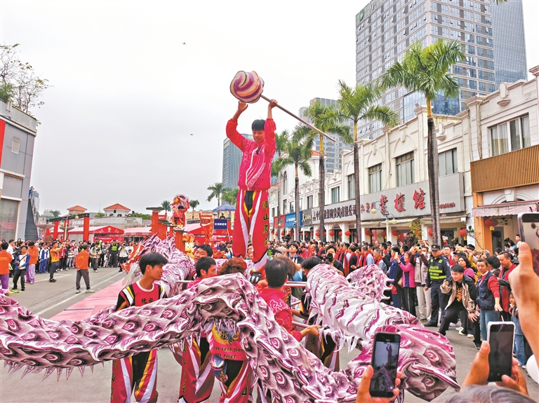 上午10时,开市仪式在番禺沙涌鳌鱼舞《独占鳌头》中拉开帷幕,“喜洋洋”“乐融融”也来到现场与市民互动,传统非遗与全运元素的碰撞,瞬间点燃现场气氛。