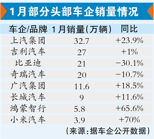 自主品牌榜上,吉利汽车1月乘用车销量达27.01万辆,同比增长1%,环比增长14%;比亚迪开年承压,1月其销量仅为21万辆,同比大跌30%、环比腰斩50%。这是近四年来,比亚迪首次在月度自主品牌榜上被吉利反超。
