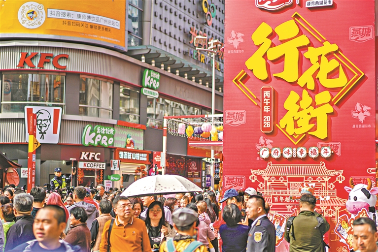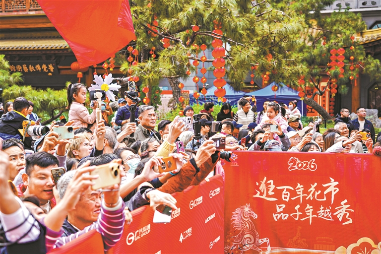 2月13日上午,2026年广州越秀西湖花市启市迎客,也宣告广州传统迎春花市全面开市。今年,广州市市场监管局联合越秀区政府、广州日报报业集团等单位,策划了全市统一的迎春花市开市仪式,持续擦亮“广州过年,花城看花”城市IP。