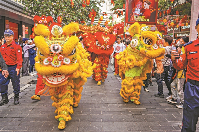 瑞狮跃动,喜气盈门,一场传统与科技交融的醒狮表演在现场精彩上演,国家级非物质文化遗产醒狮与4头“科技新星”机器狮共舞迎客。随后,“南越王卫队”登上西湖花市主牌楼“共乐楼”,气势恢宏地开启了盛大的仪式。