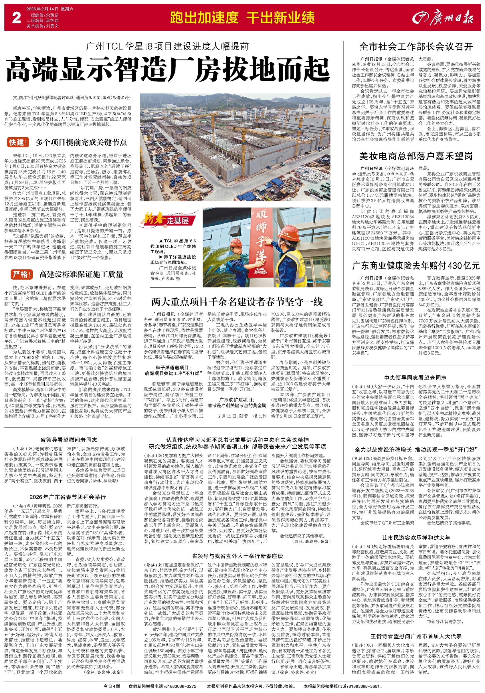 - 2026年广东省春节团拜会举行 (上接1版)黄坤明说,2026年是“十五五”开局之年,是我们党成立105周年、红军长征胜利90周年。接过历史接力棒,立足发展新起点,我们要坚定扛起走在前、作示范、挑大梁的责任担当,全力跑好“十五五