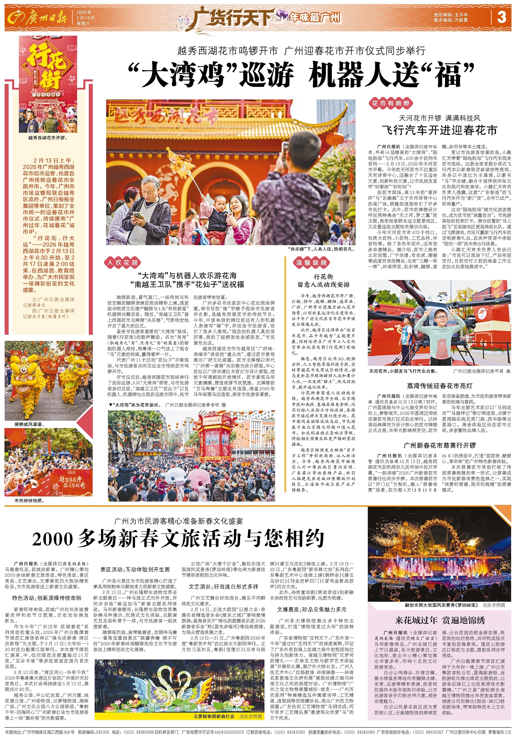 - “大湾鸡”巡游 机器人送“福” 2月13日上午,2026年广州越秀西湖花市启市迎客,也宣告广州传统迎春花市全面开市。今年,广州市市场监管局联合越秀区政府、广州日报报业集团等单位,策划了全市统一的迎春花市开市仪式,持续擦亮“广州过