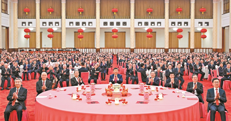 人民大会堂宴会厅灯光璀璨、喜气洋洋,各界人士2000多人欢聚一堂、共迎佳节,现场洋溢着欢乐祥和的节日气氛。