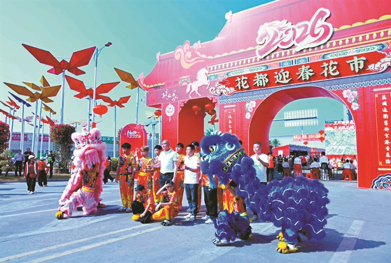 广州日报讯 (全媒体记者董业衡 通讯员花都花市办)2月14日上午,伴随着激昂的战鼓擂响和欢腾的醒狮开市表演,2026年花都迎春花市在广州花卉之都园区正式拉开帷幕。