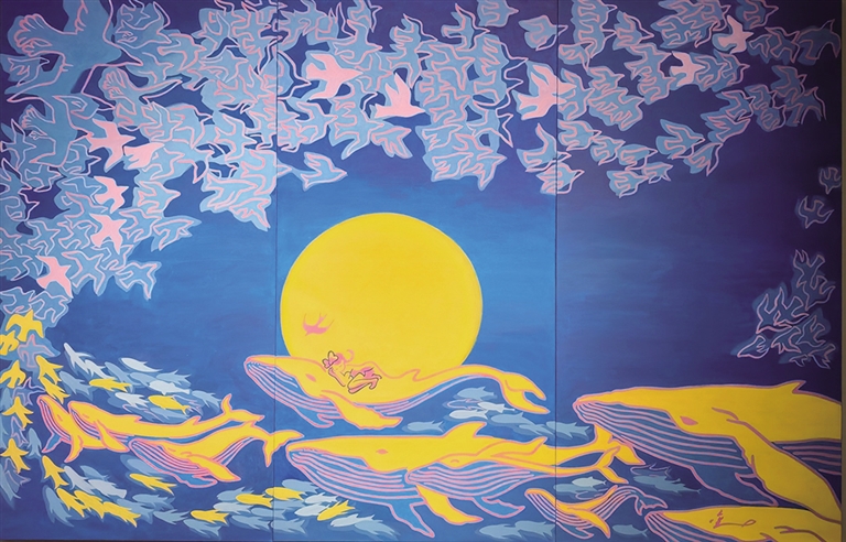 最终章“寰宇回响,星海下的寻归心之笔”呈现了一场精彩的双向奔赴。一侧是金城近年创作的极简水墨系列,如《青花喵》《墨色》《极简少女》等,融合了东方水墨与西式构成;另一侧则展现了他推动中国动漫在国际舞台精彩亮相的历程。这昭示着,中国动漫的发展不仅要吸收国外优秀元素,更要回归中国传统文化,挖掘中式美学的独特魅力,才能在国际上形成核心竞争力。