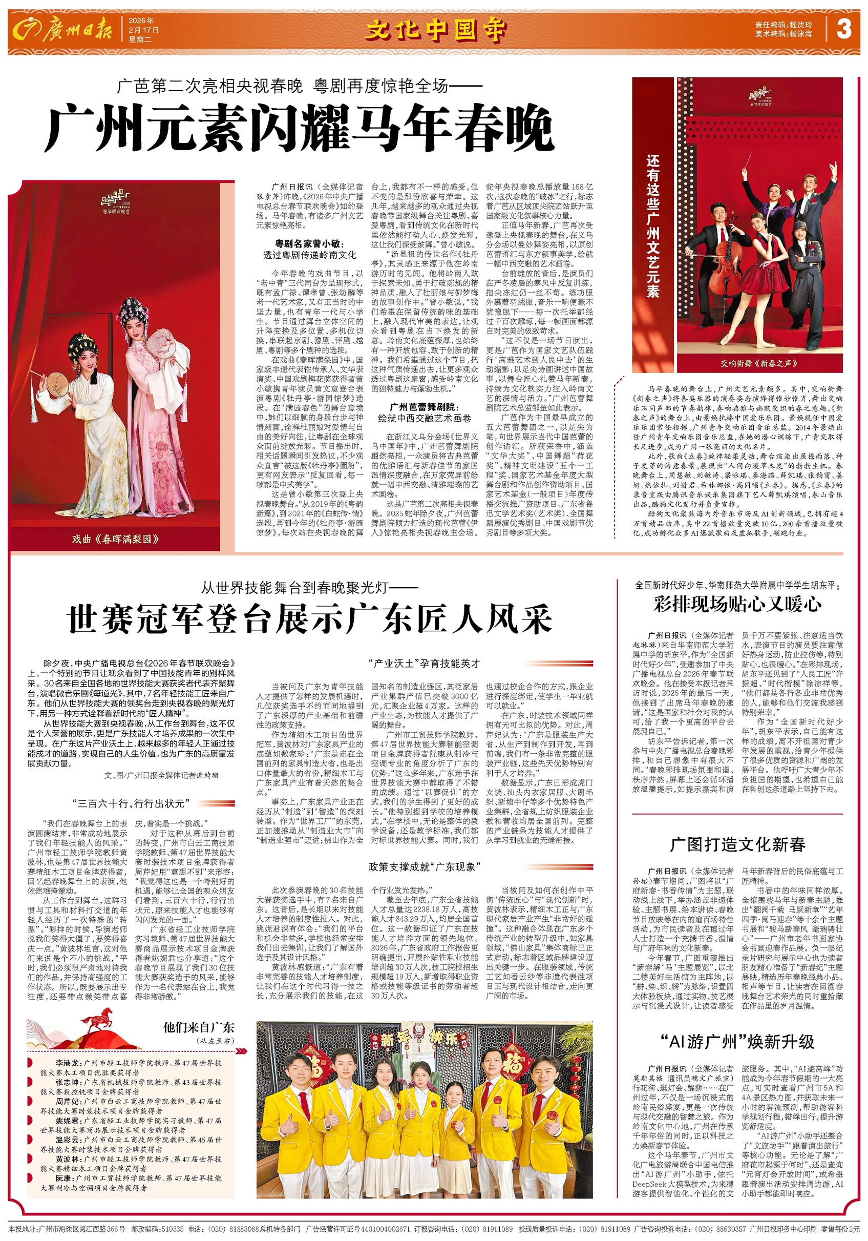 - 广州元素闪耀马年春晚 广州日报讯 (全媒体记者张素芹)昨晚,《2026年中央广播电视总台春节联欢晚会》如约登场。马年春晚,有诸多广州文艺元素惊艳亮相。 粤剧名家曾小敏:透过粤剧传递岭南文化 今年春晚的戏曲