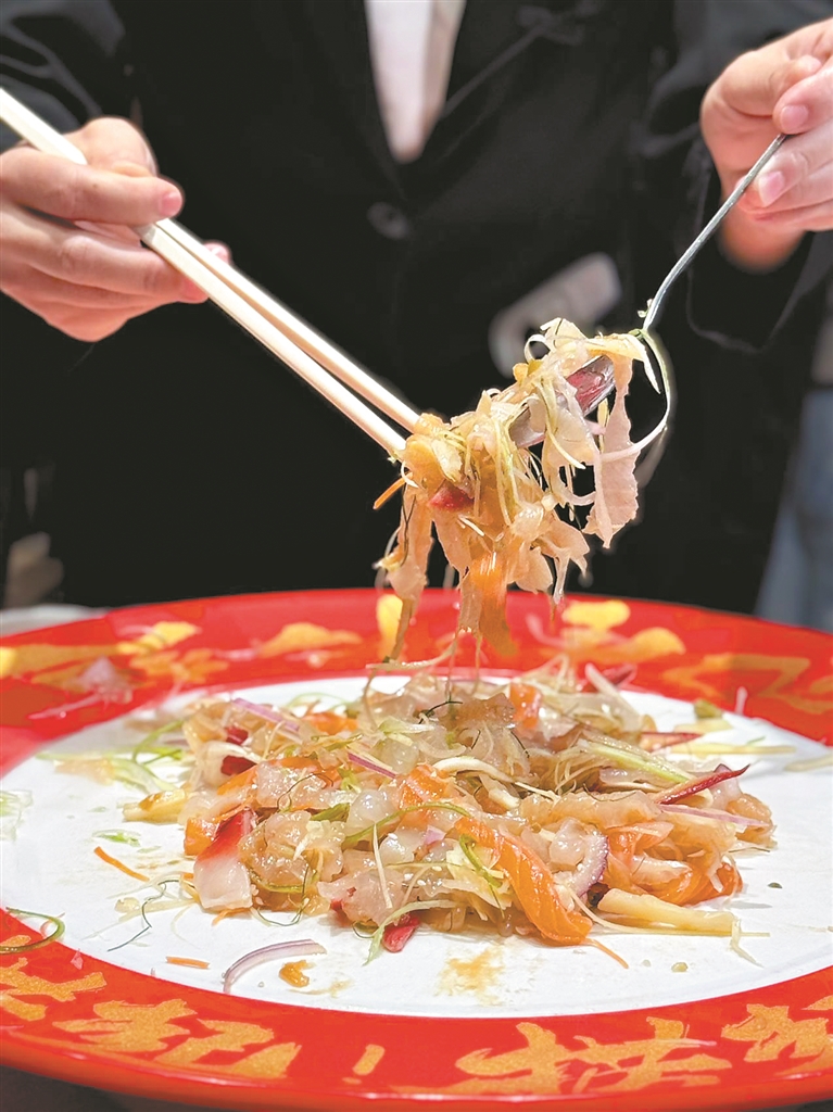 滋粥楼的泰国红胡椒焗海钓大黄鱼,是新春的招牌菜式,寓意“开运纳福”,店家严选宁德深海四年放养的大黄鱼,以泰国红胡椒与九层塔古法焗制,香气独特微辛。厨师用高温锁住鱼肉的极致鲜嫩,外皮微焦,内里嫩滑如蒜瓣,入口即化,上桌时以金剪轻启鱼身,仪式感满满。古法荔枝木烧鹅,是其历经二十载技艺沉淀的经典之作,更是广府粤菜的灵魂菜式,烧鹅采用传统古法炮制,历经十二小时多重工序精制。而经典菜肴“风生水起”,是滋粥楼对传统顺德鱼生的创新演绎,此菜仪式感满满,鱼生清亮透光、薄如蝉翼。店家选用新鲜优质鱼材,现点现切,最大程度保留了鱼肉的鲜甜本味,搭配罗氏虾、北极贝等配料,众人齐举筷子,将食材高高拌匀,一边拌匀,一边高呼“捞起”:“一捞身体健康,二捞财源广进,三捞生意兴隆。”欢腾的仪式感,将新春的喜庆氛围拉满。
