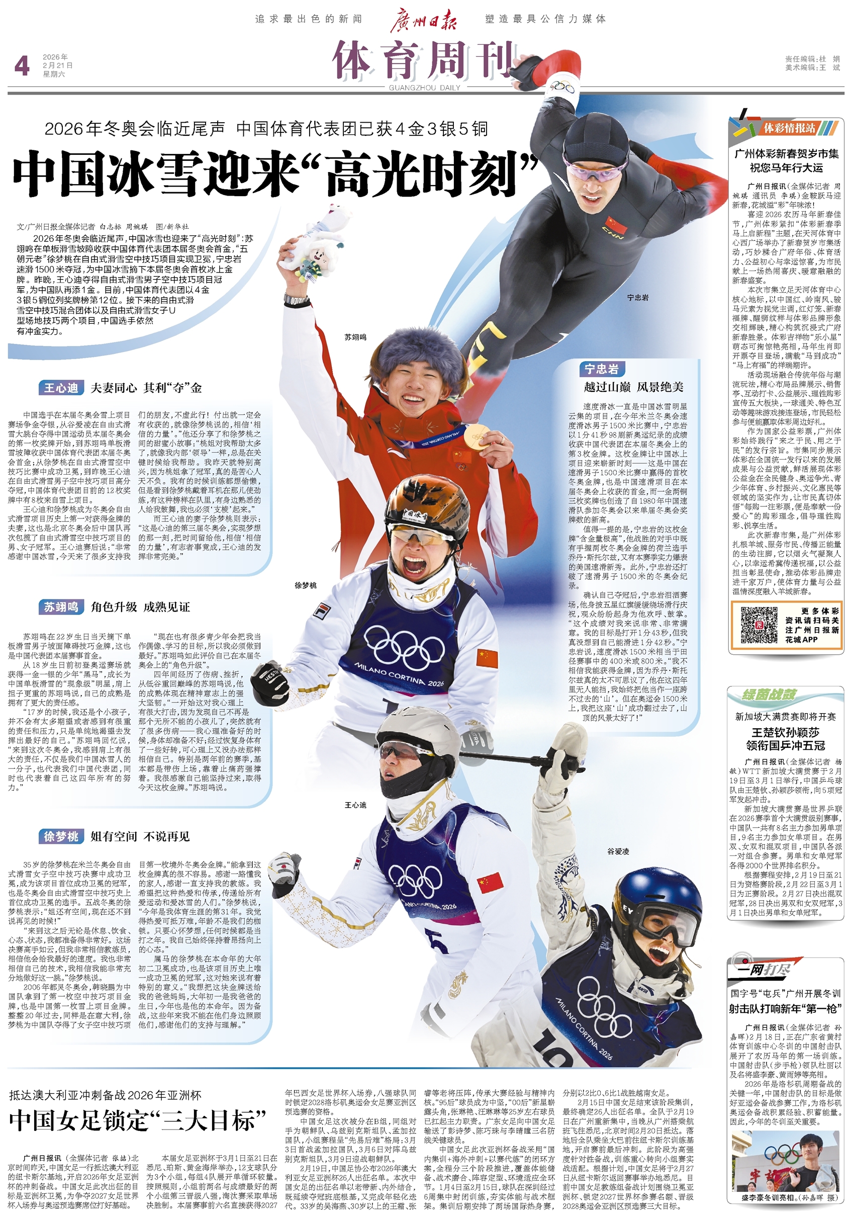 - 中国冰雪迎来“高光时刻” 文/广州日报全媒体记者 白志标 周婉琪 图/新华社 2026年冬奥会临近尾声,中国冰雪也迎来了“高光时刻”:苏翊鸣在单板滑雪坡障收获中国体育代表团本届冬奥会首金,“五朝元老”徐梦桃在自由
