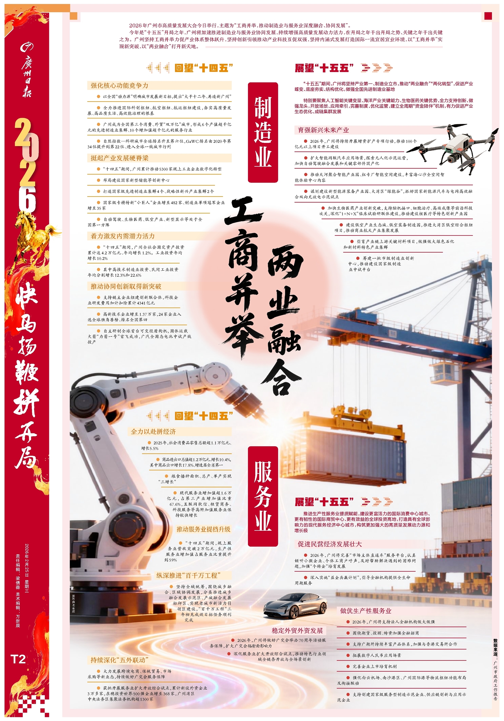 2026年广州市高质量发展大会今日举行,主题为“工商并举,推动制造业与服务业深度融合、协同发展”。 今年是“十五五”开局之年,广州将加速推进制造业与服务业协同发展,持续增强高质量发展动力活