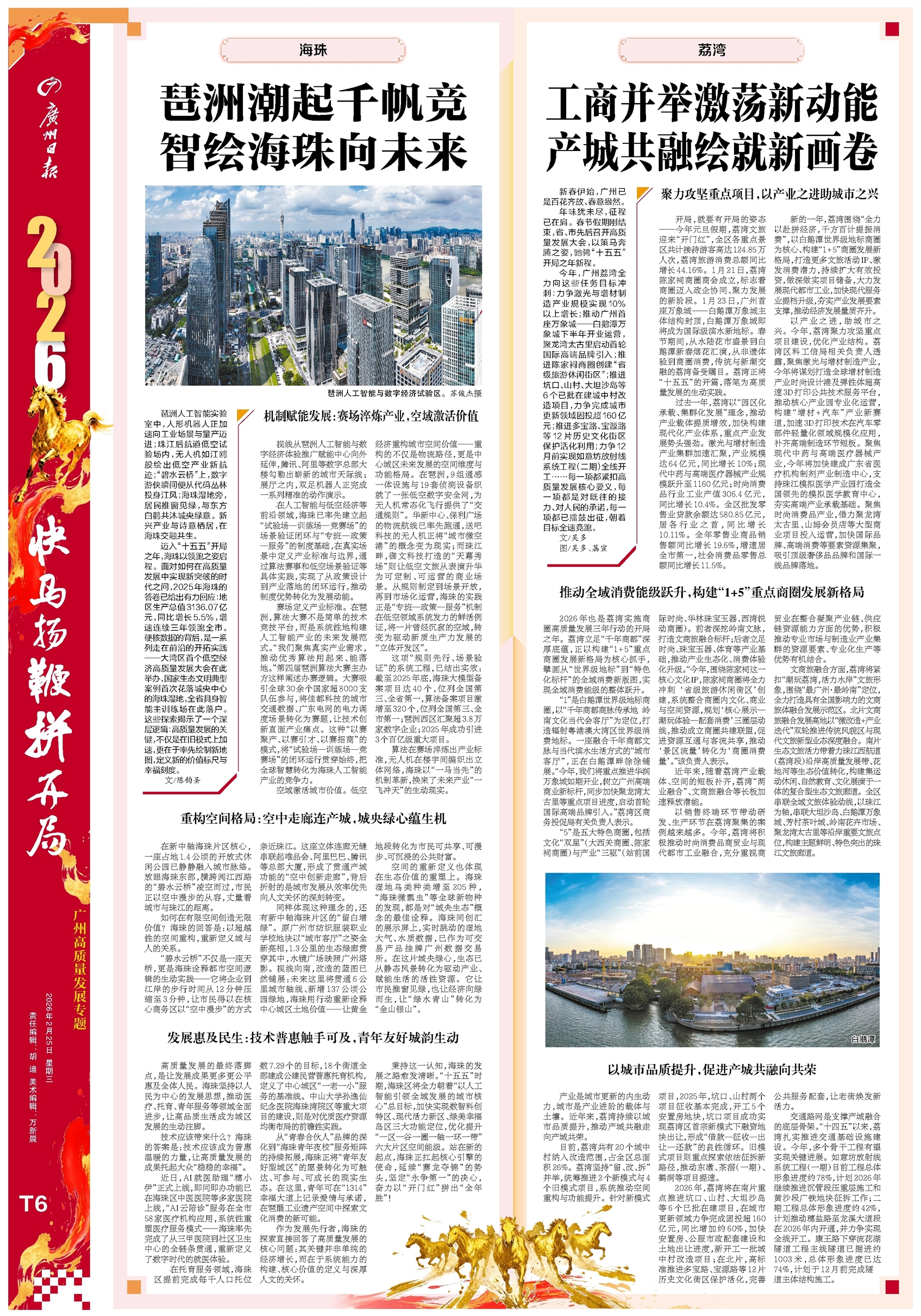 - 工商并举激荡新动能 产城共融绘就新画卷 新春伊始,广州已是百花齐放、春意盎然。 年味犹未尽,征程已在肩。春节假期刚结束,省、市先后召开高质量发展大会,以策马奔腾之姿,驰骋“十五五”开局之年新程。 今年,广州荔湾全力向这些任