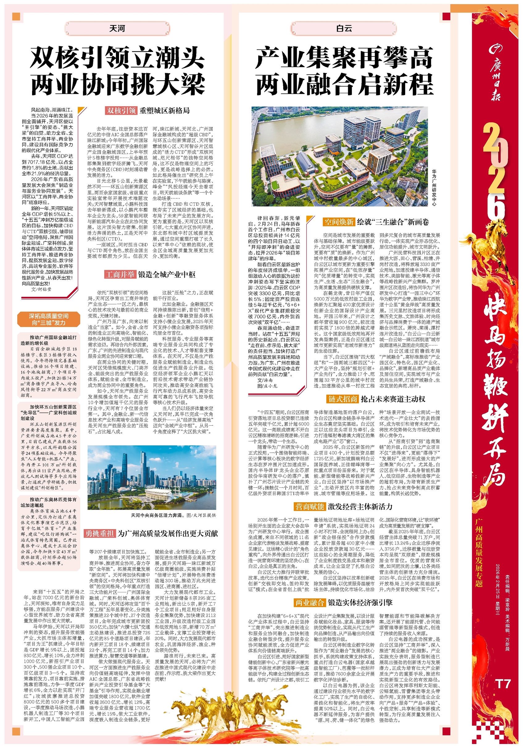 - 双核引领立潮头 两业协同挑大梁 风起南海,潮涌珠江。 当2026年的发展蓝图全面铺开,天河区便以“主引擎”的姿态、“挑大梁”的自觉,助力全省、全市坚持工商并举、两业协同,建设具有国际竞争力的现代化产业体系。 去年,天河区