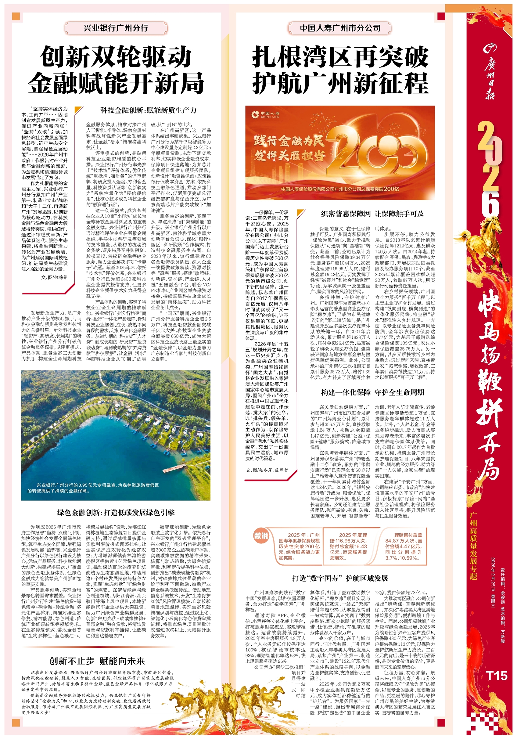 - 兴业银行广州分行:创新双轮驱动 金融赋能开新局 “坚持实体经济为本、工商并举……因地制宜发展新质生产力,促进产业向新向强”“坚持‘双碳’引领,加快经济社会发展全面绿色转型,筑牢生态安全屏障,增强绿色发展动能”……2026年广州市政府工作报告对产