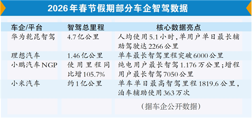 智能辅助驾驶则成为全国新能源车主长途出行的“标配”,华为、小鹏、小米等企业的技术成果也迎来一次大规模实战检验。公开数据显示,华为乾昆智驾春节期间辅助驾驶里程超4.7亿公里,同比增长235%;小米汽车智能辅助驾驶总里程达1亿公里。