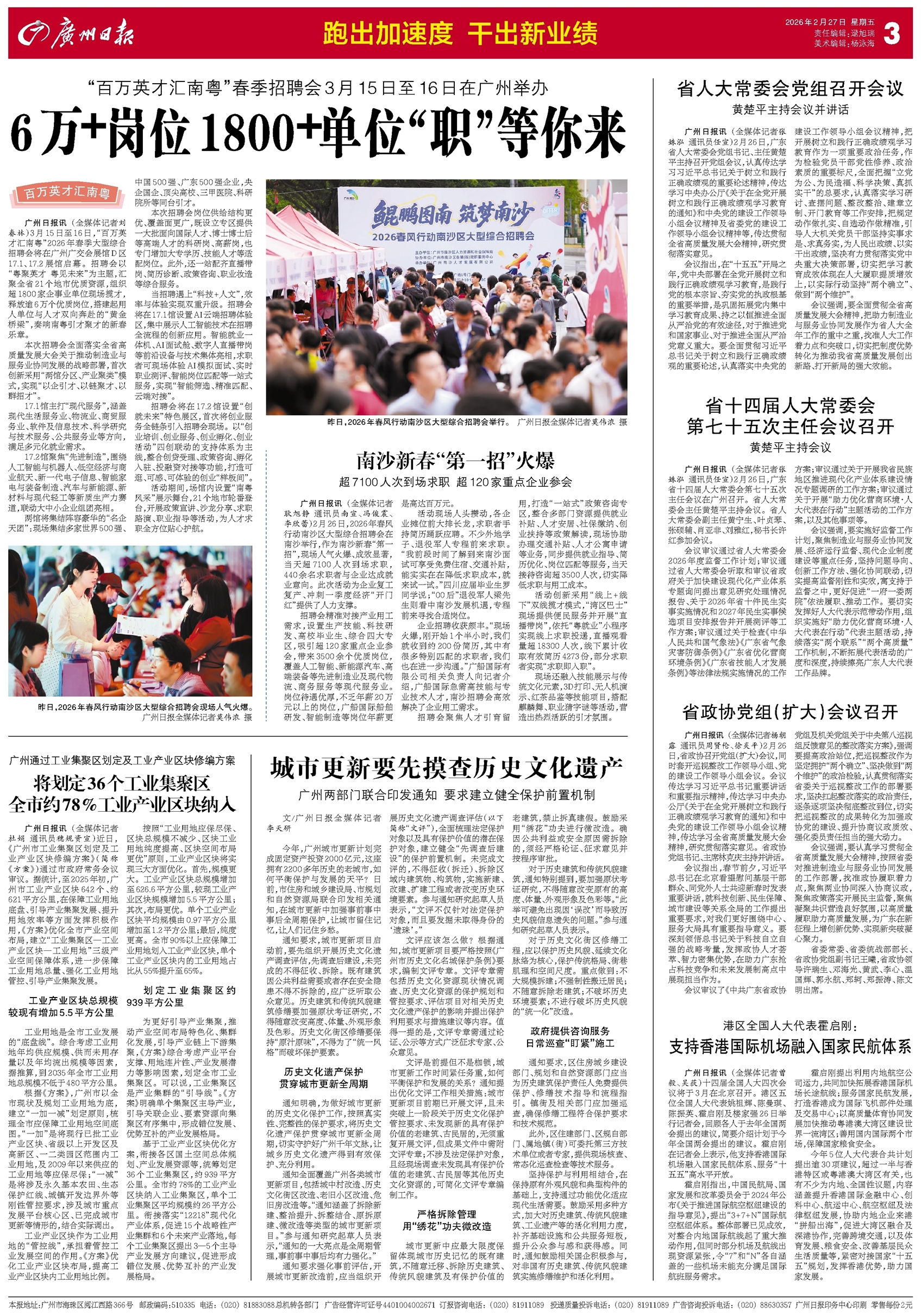 - 南沙新春“第一招”火爆 广州日报讯 (全媒体记者耿旭静 通讯员南宣、冯俊震、李欣蕾)2月26日,2026年春风行动南沙区大型综合招聘会在南沙举行,作为南沙新春“第一招”,现场人气火爆、成效显著,当天超7100人次到场求职