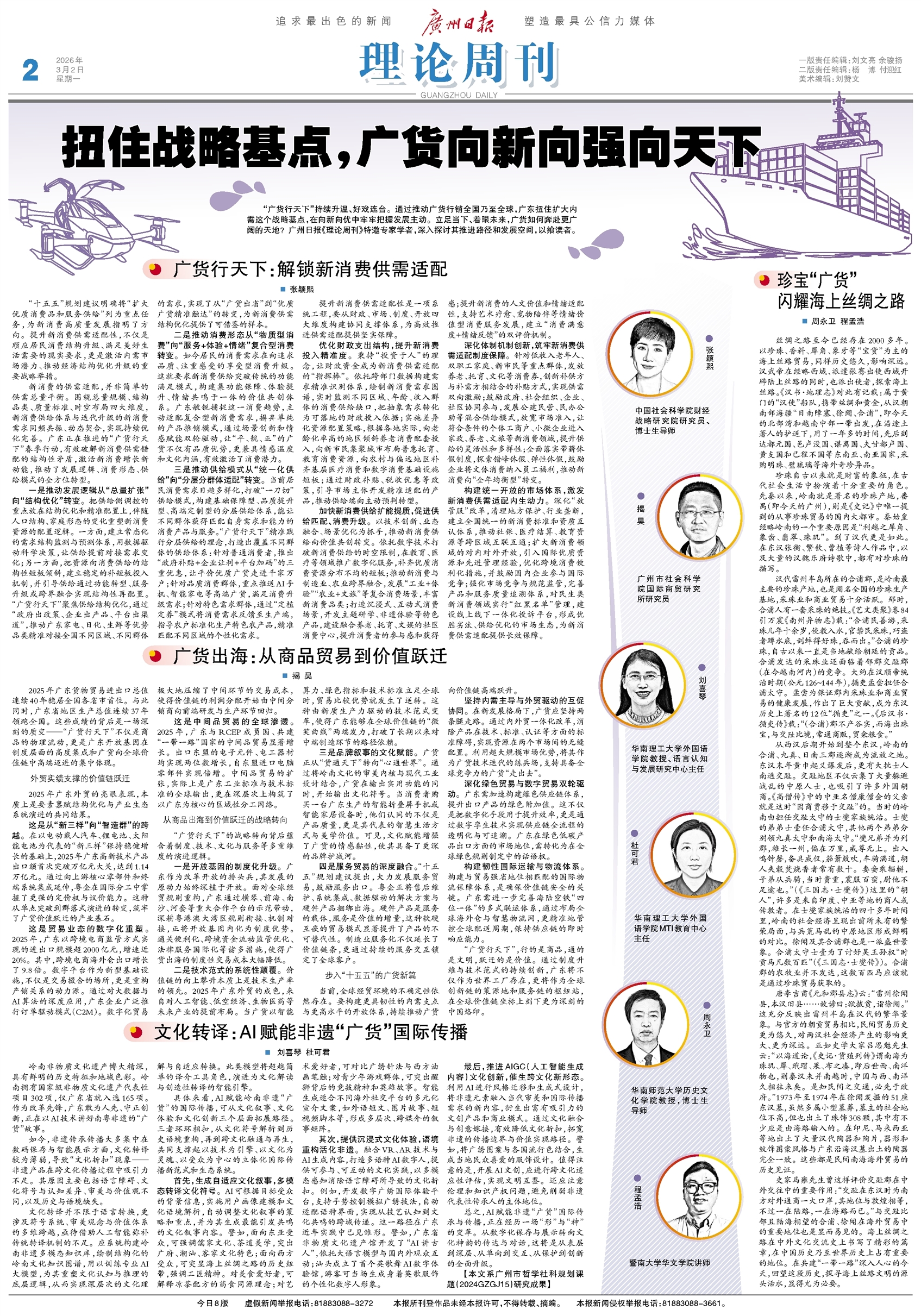 “广货行天下”持续升温、好戏连台。通过推动广货行销全国乃至全球,广东扭住扩大内需这个战略基点,在向新向优中牢牢把握发展主动。立足当下、着眼未来,广货如何奔赴更广阔的天地?广州日报《理论周刊》特邀专家学者,深入探讨其推进路径和发展空间,以飨读者。