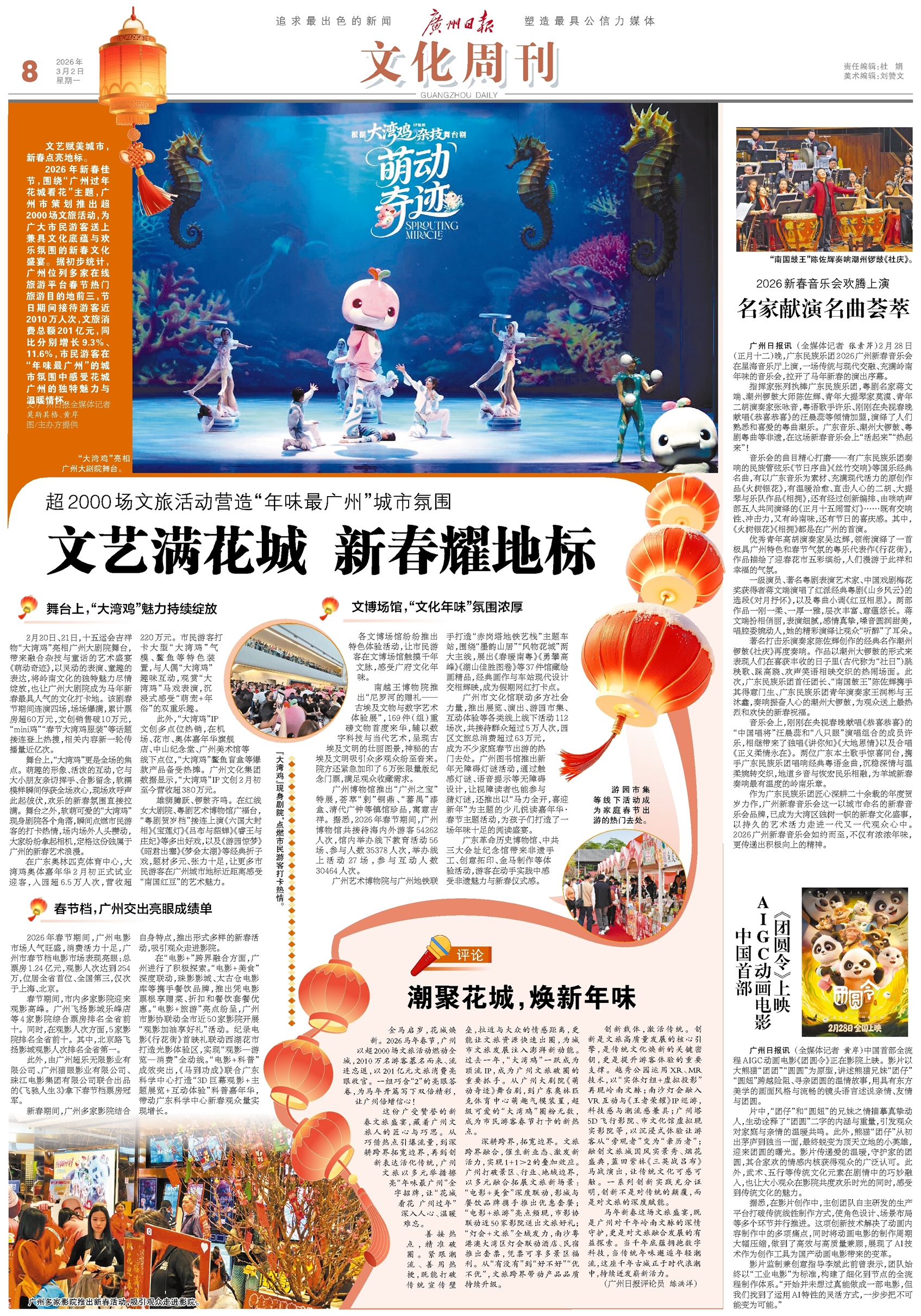 - 潮聚花城,焕新年味 评论 金马启岁,花城焕新。2026马年春节,广州以超2000场文旅活动燃动全城,2010万名游客慕名而来、流连忘返,以201亿元文旅消费亮眼收官。一组巧含“2”的亮眼答卷,为马年开篇写下双倍精