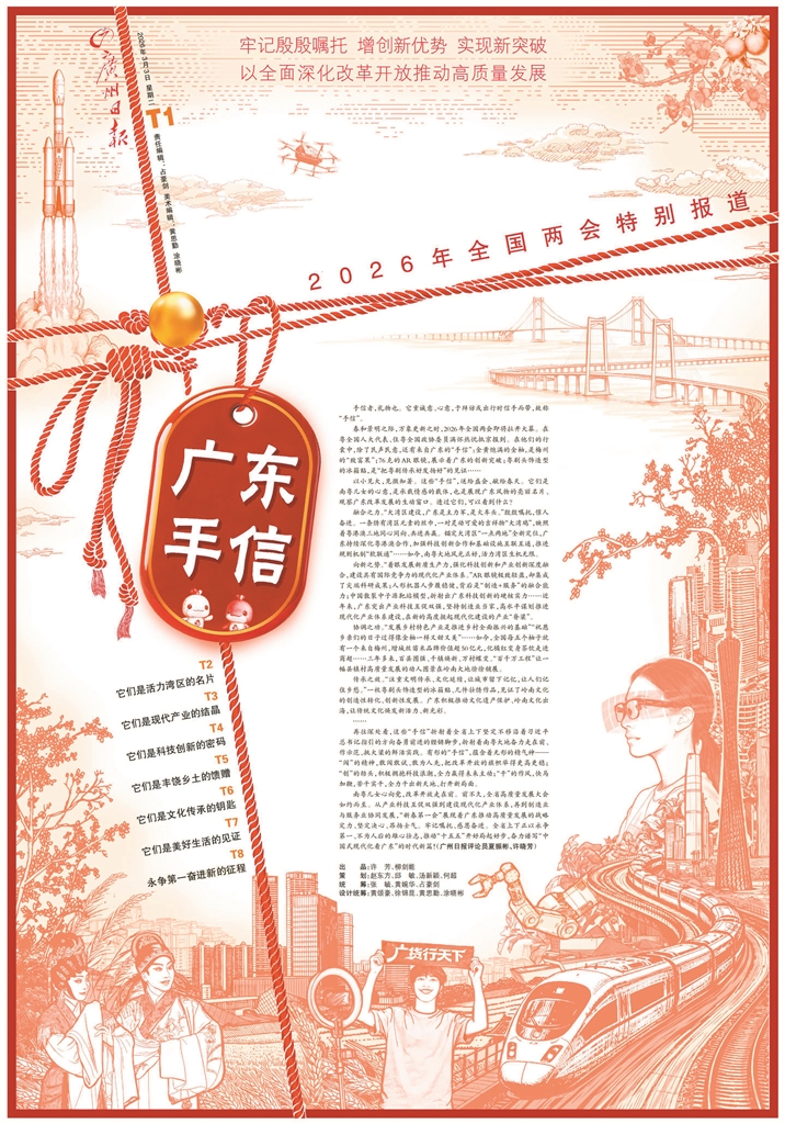广州日报讯 在粤全国人大代表和住粤全国政协委员赴京履职之际,本报紧扣习近平总书记对广东系列重要讲话和重要指示精神推出8个大版《广东手信》全国两会特别报道和主题海报、AI短视频、互动H5等融媒产品,以代表委员携带的“广东手信”如梅州金柚子、增城丝苗米、“大湾鸡”、具身智能机器人等为载体,将总书记殷殷嘱托转化为具象表达,串联起“代表委员履职实践—广东高质量发展成就—‘十五五’规划”的多层次图景,在“十五五”开局之年向总书记交出南粤奋进路线图。结合“广货行天下”,《广东手信》还化身特别“直播间”,邀请代表委员作为“好物推荐官”宣介家乡的科技广货、智造广货、文化广货。报道以“手信”为媒,融合创意手绘与AI技术进行艺术创作,令两会报道可亲、可触、可感。