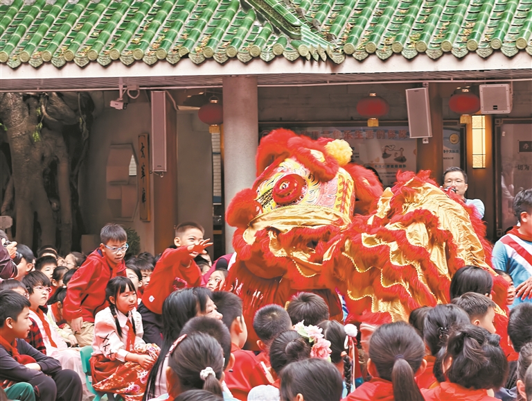 开学第一天,文德路小学用威猛的“大醒狮”和萌萌的“小醒狮”,一起迎接新同学。“摸摸醒狮头,万事不用愁”,开学典礼上当醒狮来到观众席,同学们纷纷热情地摸起醒狮脑袋来。文德路小学党总支书记陈康英介绍,本学期开学典礼学校以“文润德泽、以文化人”为理念,设计了一系列有温度、有特色、有传承的迎新环节。醒狮点睛、汉服走秀、迎春花走秀、思政第一课等活动,让学校一开学就充满传统文化气息和广府年味。