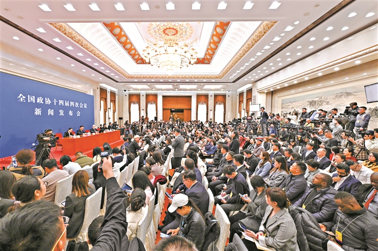 人民大会堂一层新闻发布厅,座无虚席。中外记者早早到达会场,实时向世界各地播报发布会最新情况。