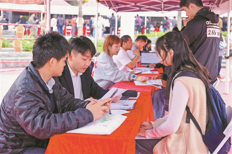 值得一提的是,招聘会全方位升级求职体验、岗位供给与服务保障,构建“线下+线上”“智能+人工”多元化就业服务体系,为求职者和企业带来全新对接体验。现场设有AI求职终端,搭配数字人在线服务,为求职者精准筛选岗位、匹配需求,实现人岗高效对接。此外,岭南非遗技艺展示区让求职者近距离感受岭南非遗的独特魅力。