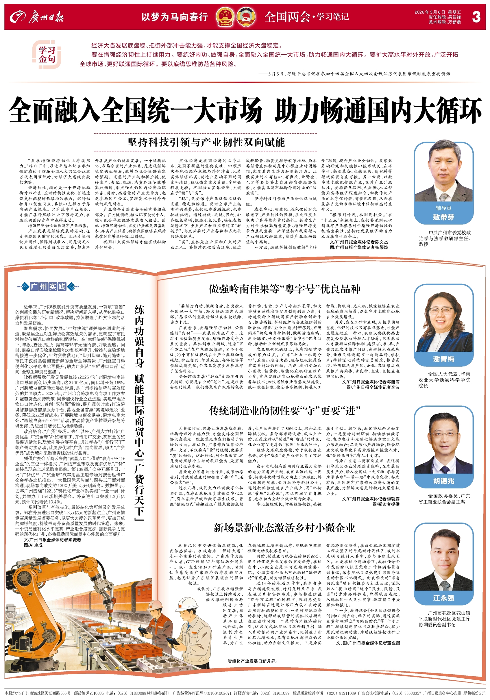 作为广东省工商联副主席,我还将引导民营企业紧跟国家战略,在发展新质生产力、融入全国统一大市场、参与高质量共建“一带一路”中找准定位、奋发有为,共同筑牢广东作为经济大省的发展底盘,为经济大省更好挑起大梁贡献力量。