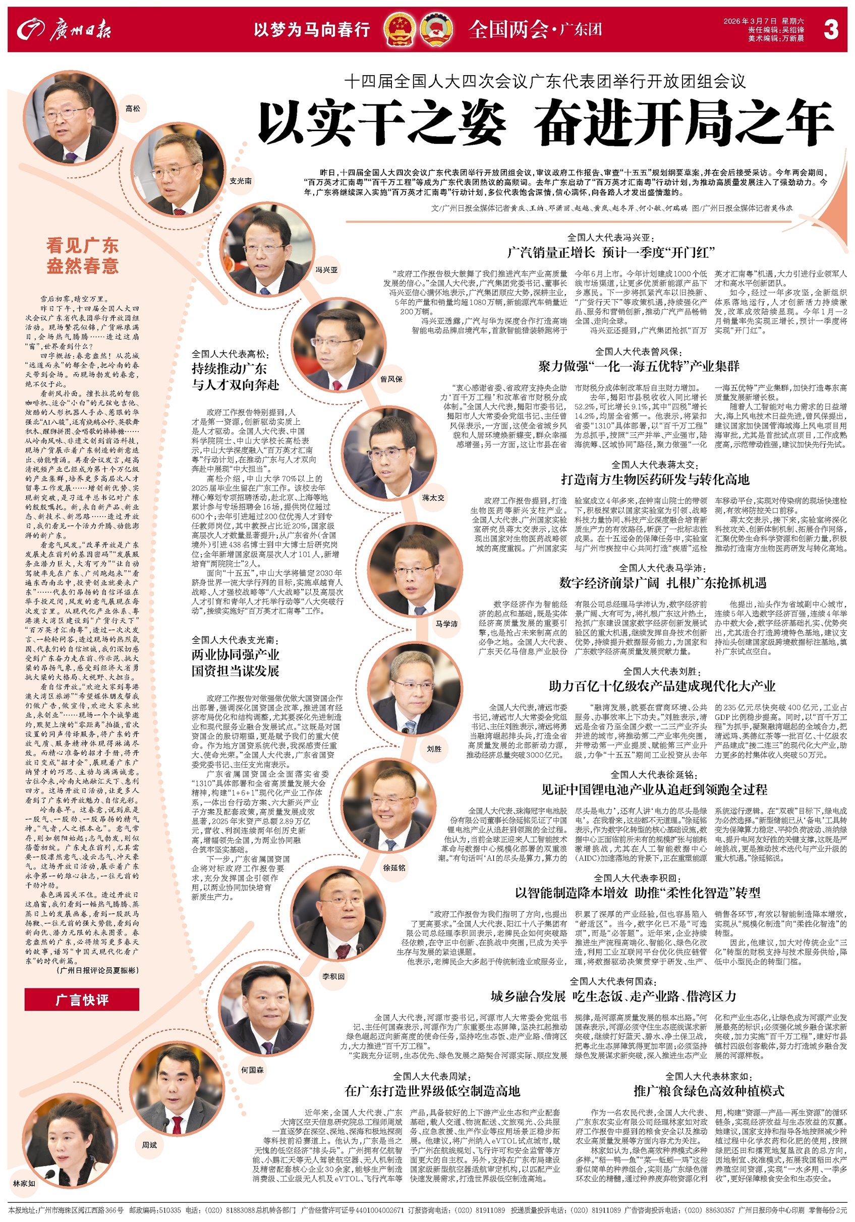 昨日,十四届全国人大四次会议广东代表团举行开放团组会议,审议政府工作报告、审查“十五五”规划纲要草案,并在会后接受采访。今年两会期间,“百万英才汇南粤”“百千万工程”等成为广东代表团热议的高频词