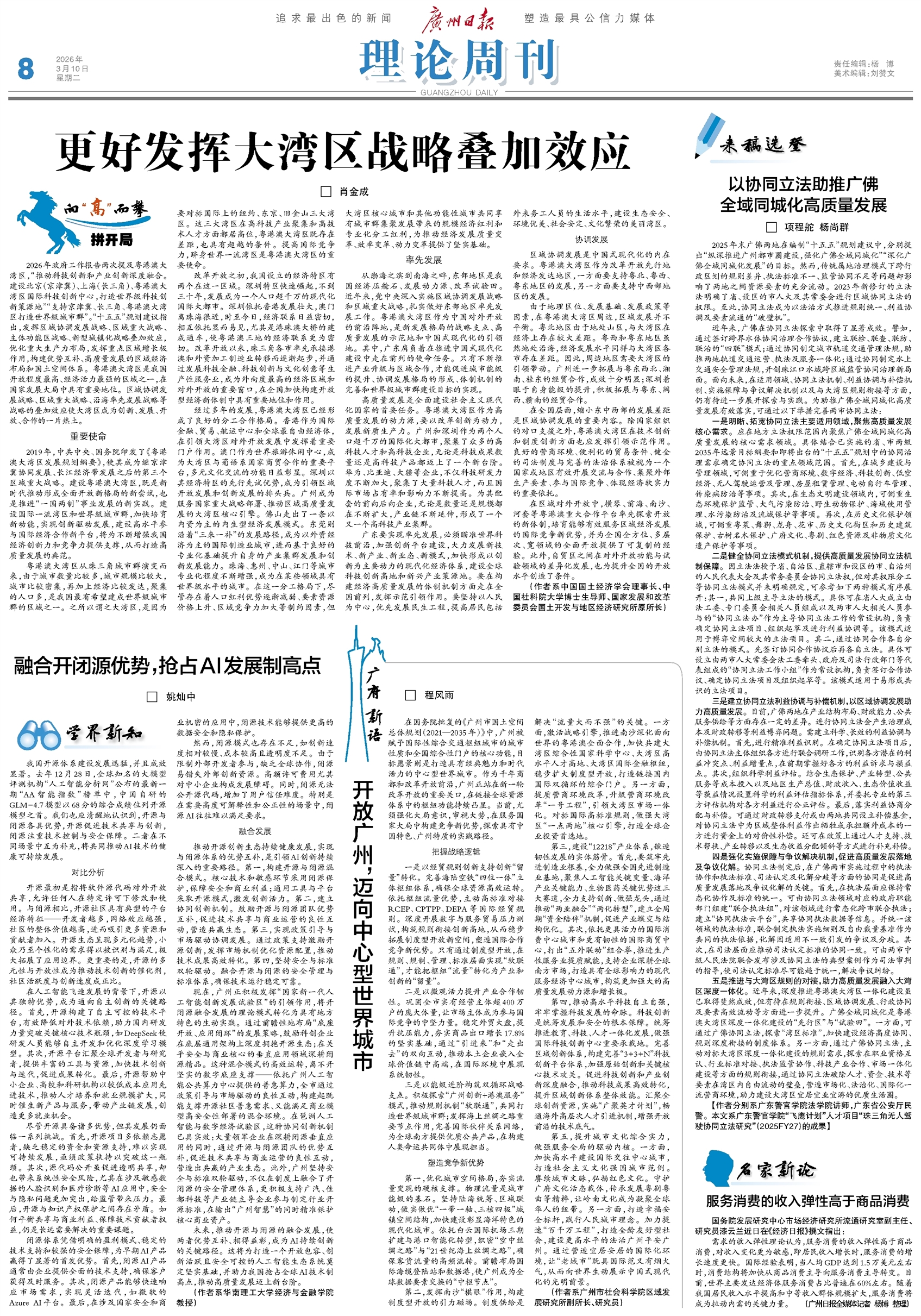 2026年政府工作报告两次提及粤港澳大湾区,“推动科技创新和产业创新深度融合。建设北京(京津冀)、上海(长三角)、粤港澳大湾区国际科技创新中心,打造世界级科技创新策源地”“支持京津冀、长三角、粤港澳大湾区打造世界级城市群”。“十五五”规划建议指出,发挥区域协调发展战略、区域重大战略、主体功能区战略、新型城镇化战略叠加效应,优化重大生产力布局,发挥重点区域增长极作用,构建优势互补、高质量发展的区域经济布局和国土空间体系。粤港澳大湾区是我国开放程度最高、经济活力最强的区域之一,在国家发展大局中具有重要地位。区域协调发展战略、区域重大战略、沿海率先发展战略等战略的叠加效应使大湾区成为创新、发展、开放、合作的一片热土。