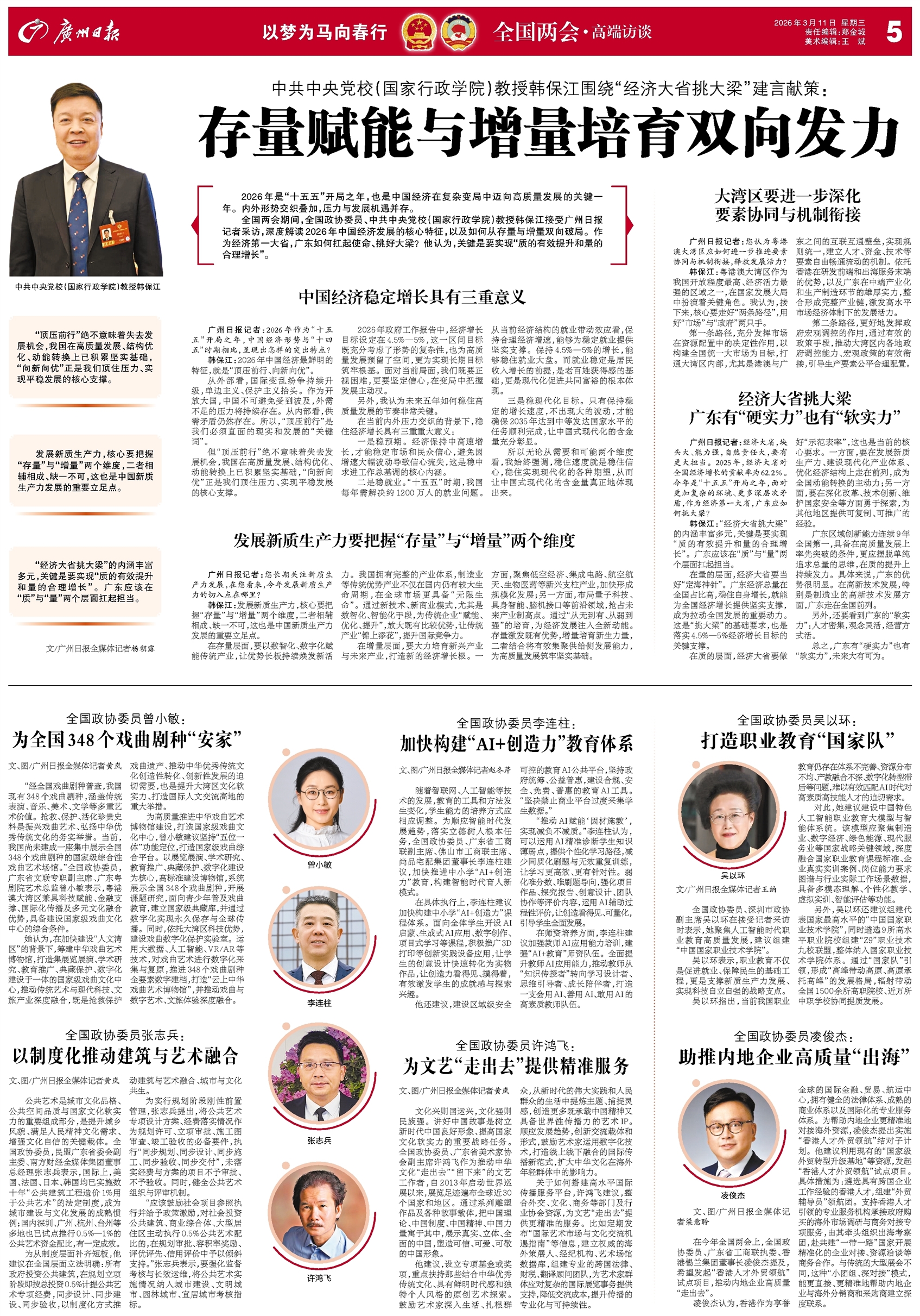 - 存量赋能与增量培育双向发力 2026年是“十五五”开局之年,也是中国经济在复杂变局中迈向高质量发展的关键一年。内外形势交织叠加,压力与发展机遇并存。 全国两会期间,全国政协委员、中共中央党校(国家行政学院)教授韩保江接受