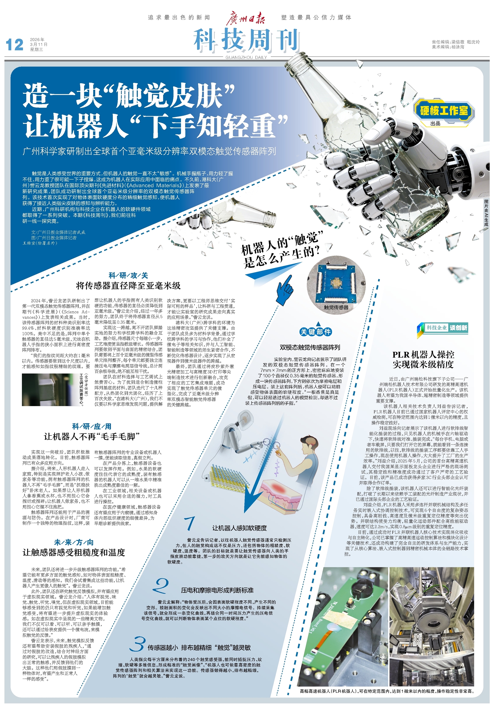 硬核工作室出品 触觉是人类感受世界的重要方式,但机器人的触觉一直不太“敏感”。机械手握瓶子,用力轻了握不住,用力重了很可能一下子捏爆,这成为机器人在实际应用中面临的痛点。不久前,港科大(广