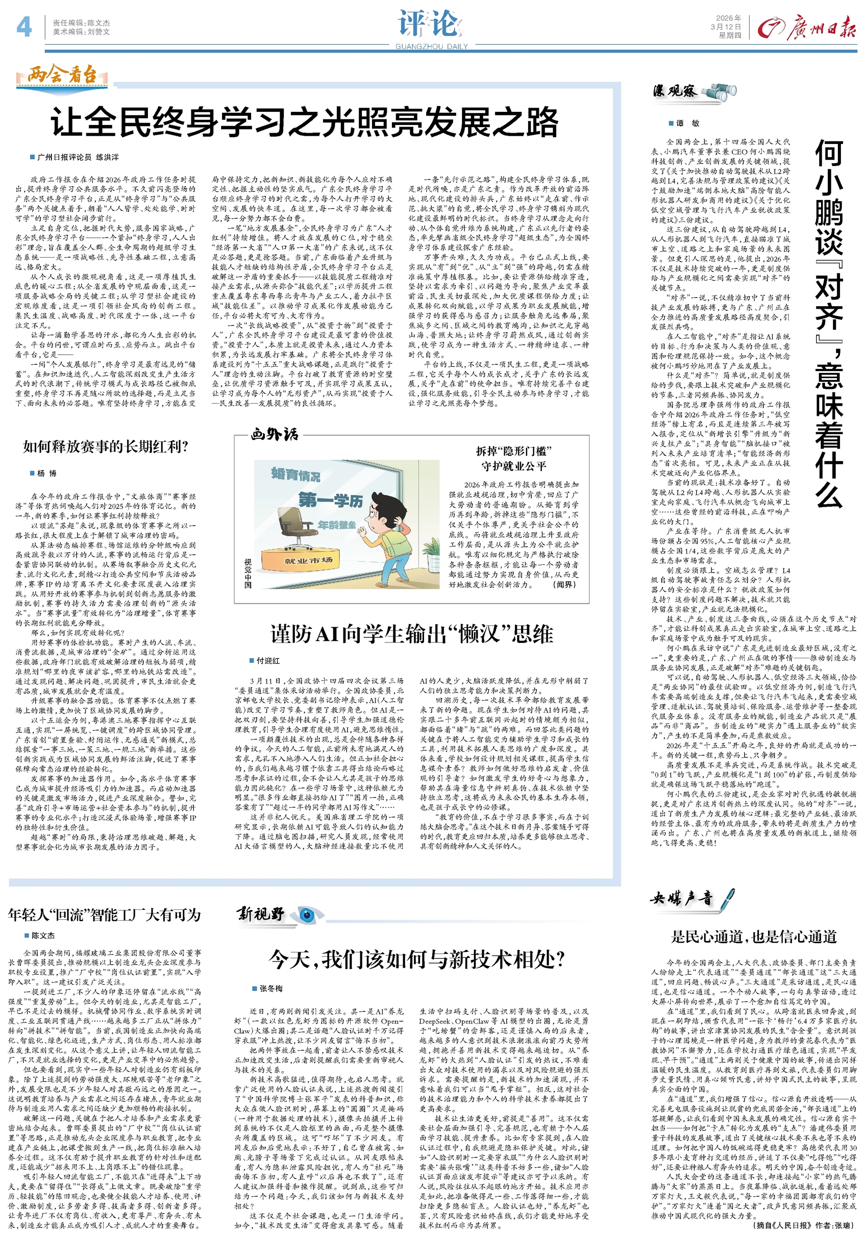 - 让全民终身学习之光照亮发展之路 广州日报评论员 练洪洋 政府工作报告在介绍2026年政府工作任务时提出,提升终身学习公共服务水平。不久前闪亮登场的广东全民终身学习平台,正是从“终身学习”与“公共服务”两个关键点着手,朝着“人