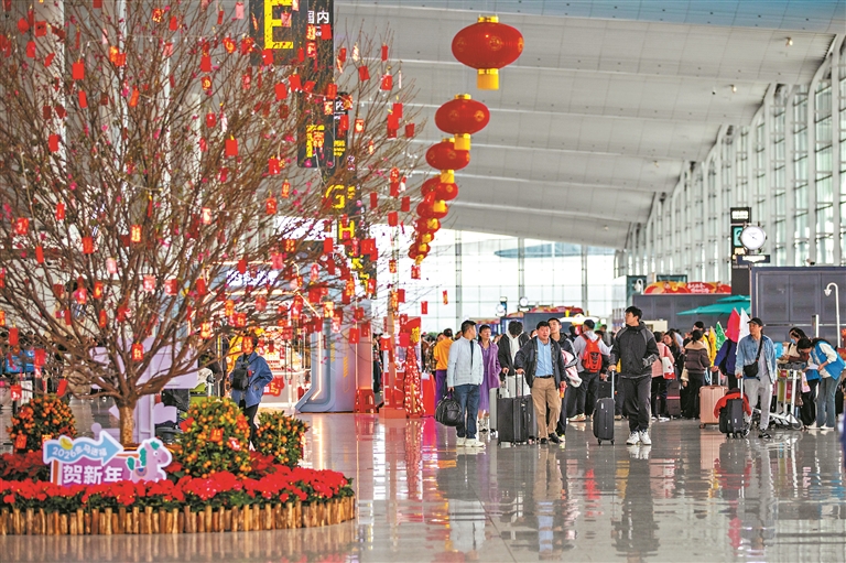 广州日报讯 (全媒体记者李妍 通讯员机场宣 摄影报道)3月13日,为期40天的2026年春运落下帷幕。数据显示,春运39天(2026年2月2日至3月12日),白云机场累计接送旅客1019万人次,成为全国首个春运接送超过千万人次旅客的机场,创历史纪录。作为T3航站楼投用后的首个春运“大考”,白云机场春运数据亮眼。2月22日、2月23日单日接送旅客分别为28.34万人次、28.64万人次,接连刷新机场单日客流量历史纪录。广州白云国际机场首次采用三座航站楼联动服务旅客,国内三大航司国航、南航和东航分别在T1、T2、T3提供服务,这在广州春运历史上前所未有。