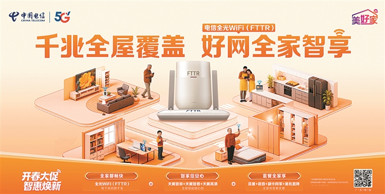 FTTR全光组网,“二次光改”秒解“抢网难”。广东电信创新的FTTR全光组网技术,让光纤直达每个房间,彻底破解过往“穿墙难”魔咒,实现全屋信号满格、无缝漫游。从孩子的在线教育到丈夫的云端电竞,从妻子的4K影音到老人的远程问诊,再多的设备同时运行也能各行其道,互不抢网,让每一个家庭成员都能畅享“处处满格、时时畅快”的数智生活。