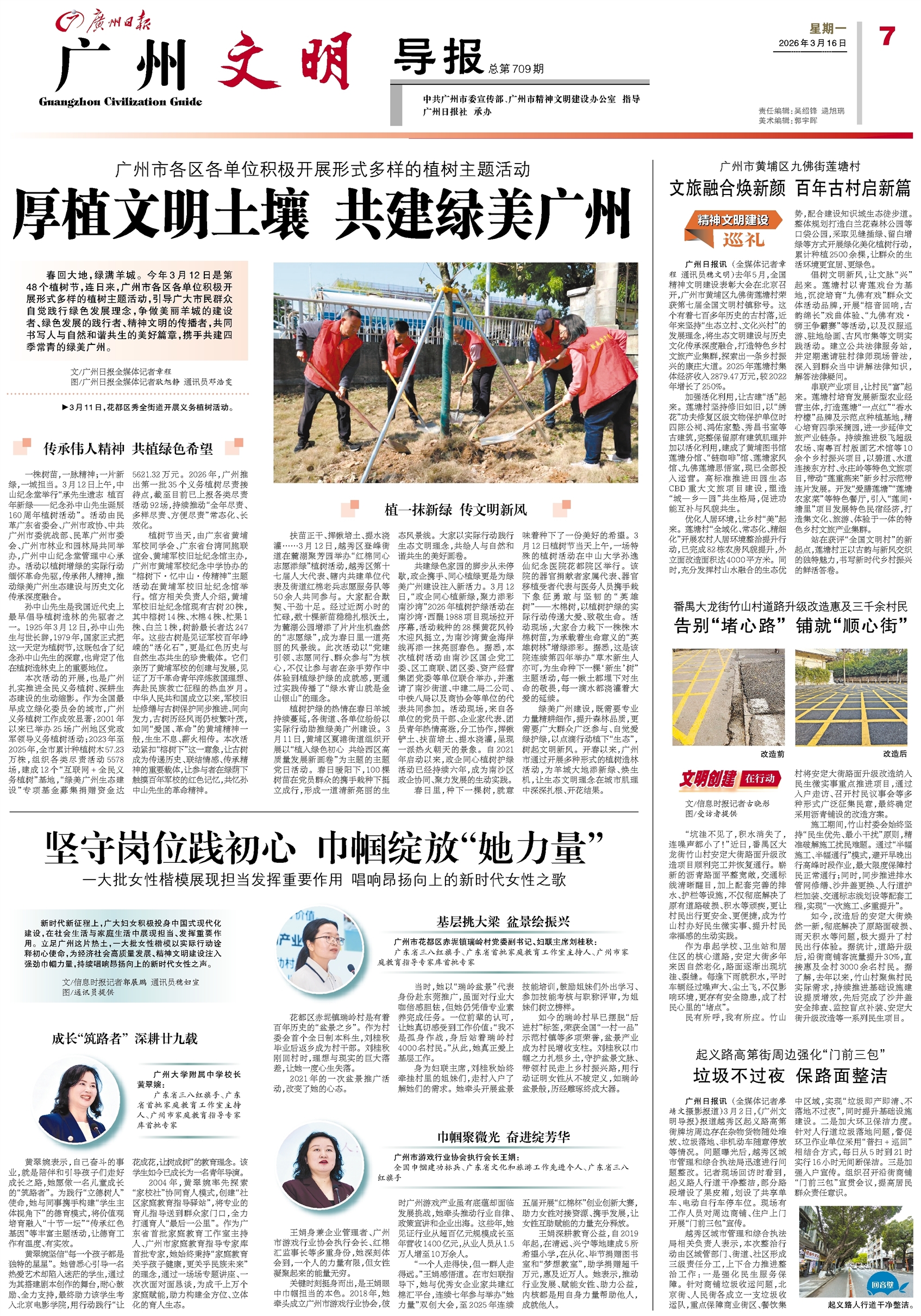 - 厚植文明土壤 共建绿美广州 春回大地,绿满羊城。今年3月12日是第48个植树节,连日来,广州市各区各单位积极开展形式多样的植树主题活动,引导广大市民群众自觉践行绿色发展理念,争做美丽羊城的建设者、绿色发展的践行者、精神文明