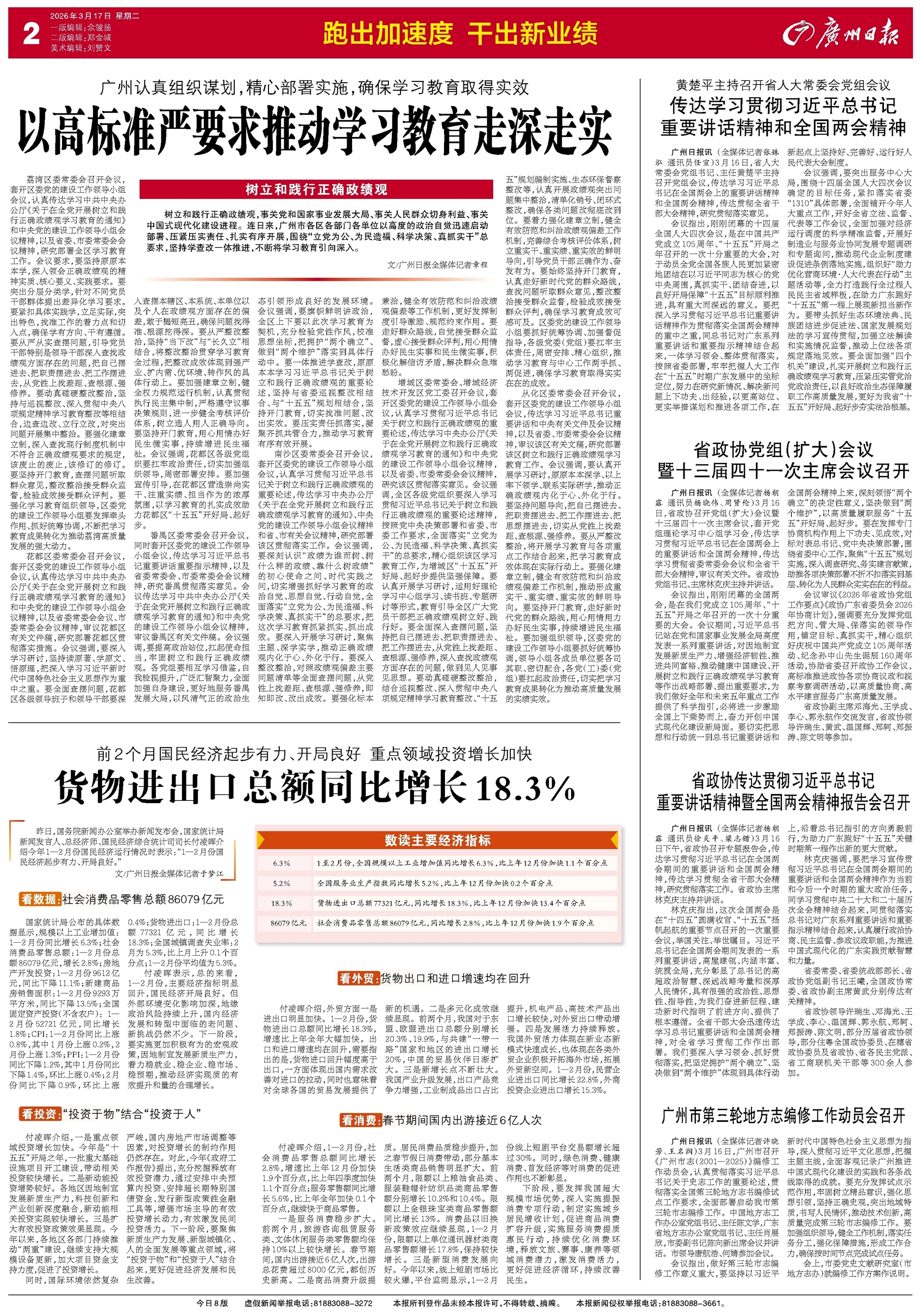 - 以高标准严要求推动学习教育走深走实 树立和践行正确政绩观,事关党和国家事业发展大局、事关人民群众切身利益、事关中国式现代化建设进程。连日来,广州市各区各部门各单位以高度的政治自觉迅速启动部署、压紧压实责任、扎实有序开展,围绕“立党为