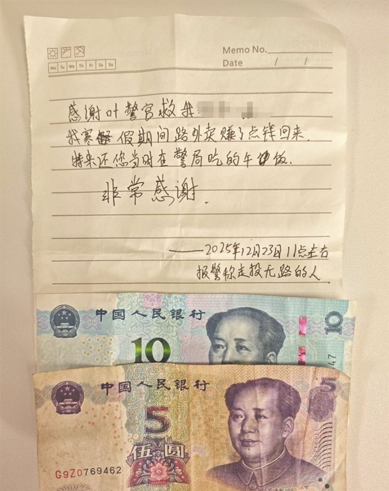 展开那封手写的感谢信,简短的文字间,透出一份朴素的守信与感激:“感谢叶警官救我。我送外卖赚了点钱回来,特来还当时在警局您给我买午饭的钱。”叶警官说:“我当时非常惊讶,也很激动,真没想到过了几个月他还记得。”他委托同事将钱退还给年轻人。