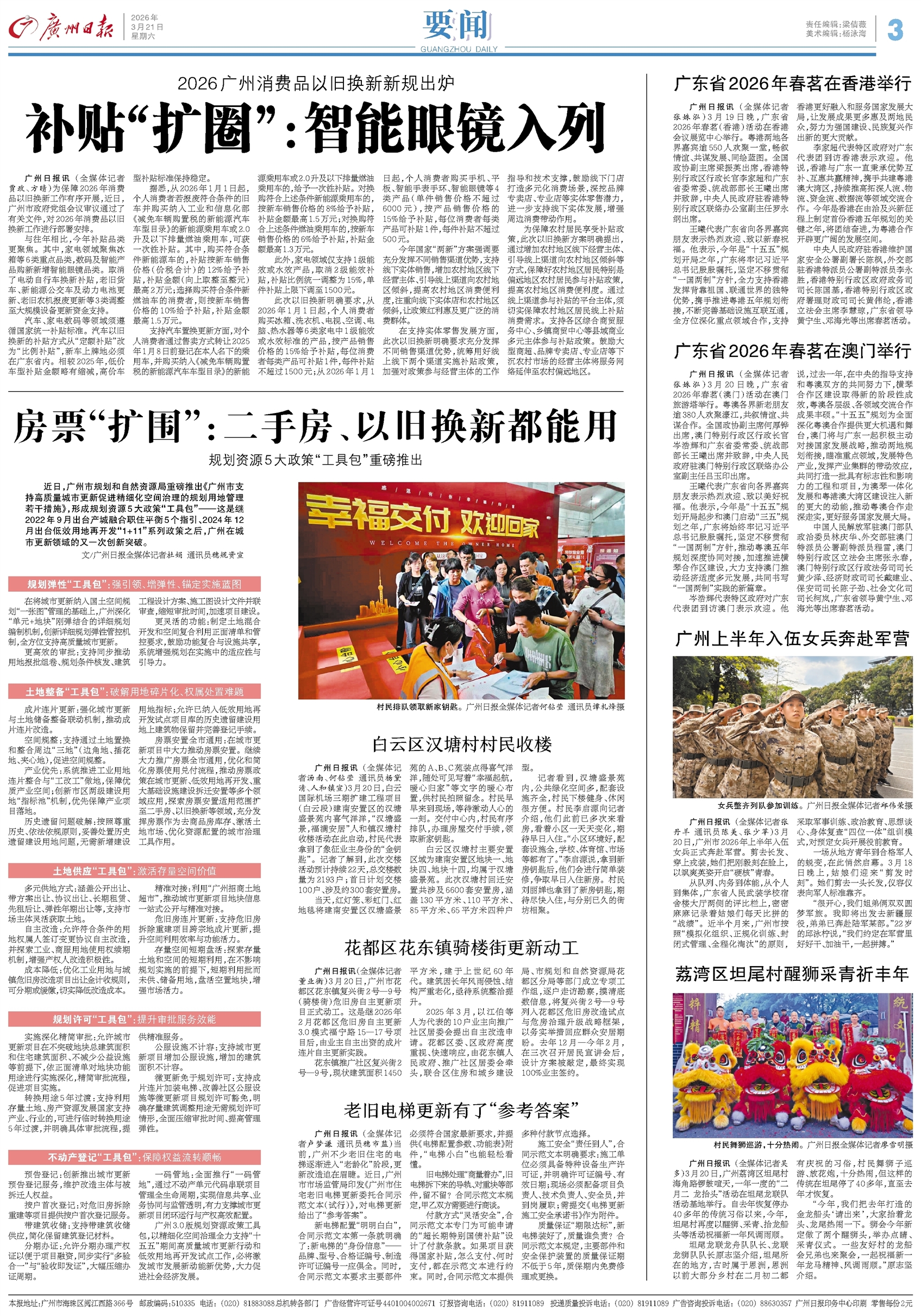 - 补贴“扩圈”:智能眼镜入列 广州日报讯 (全媒体记者 贾政、方晴)为保障2026年消费品以旧换新工作有序开展,近日,广州市政府党组会议审议通过了有关文件,对2026年消费品以旧换新工作进行部署安排。 与往年相比,今年补贴