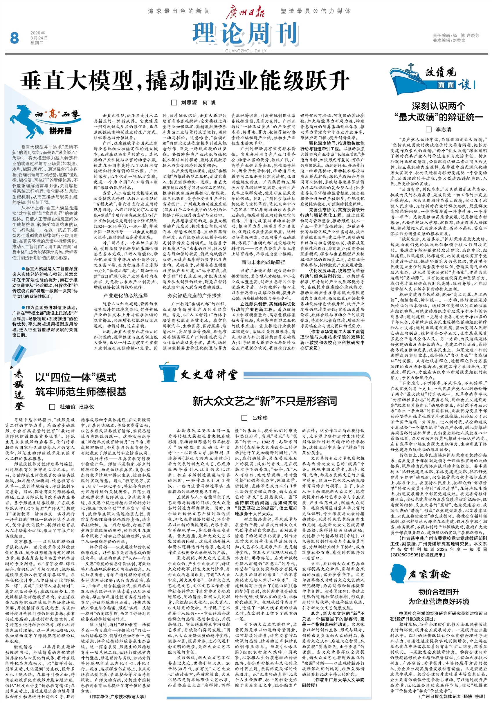 广州打造“垂模之都”的征程,正是培育新质生产力的生动实践。首先,以“人工智能+”为抓手培育新动能是关键支点。在智能网联汽车、生物医药、医疗服务、智慧水利、高端装备等领域,抢先布局垂模集群是广州构建现代化产业体系的战略先手棋。其次,通过驱动数据要素价值化配置与算力资源统筹调度,引发传统制造体系系统性重塑,是有力支撑。广州正通过“一轴三极多点”的产业空间布局,将算法、算力、数据等核心要素精准编织进产业链,推动生产函数发生静默革命。